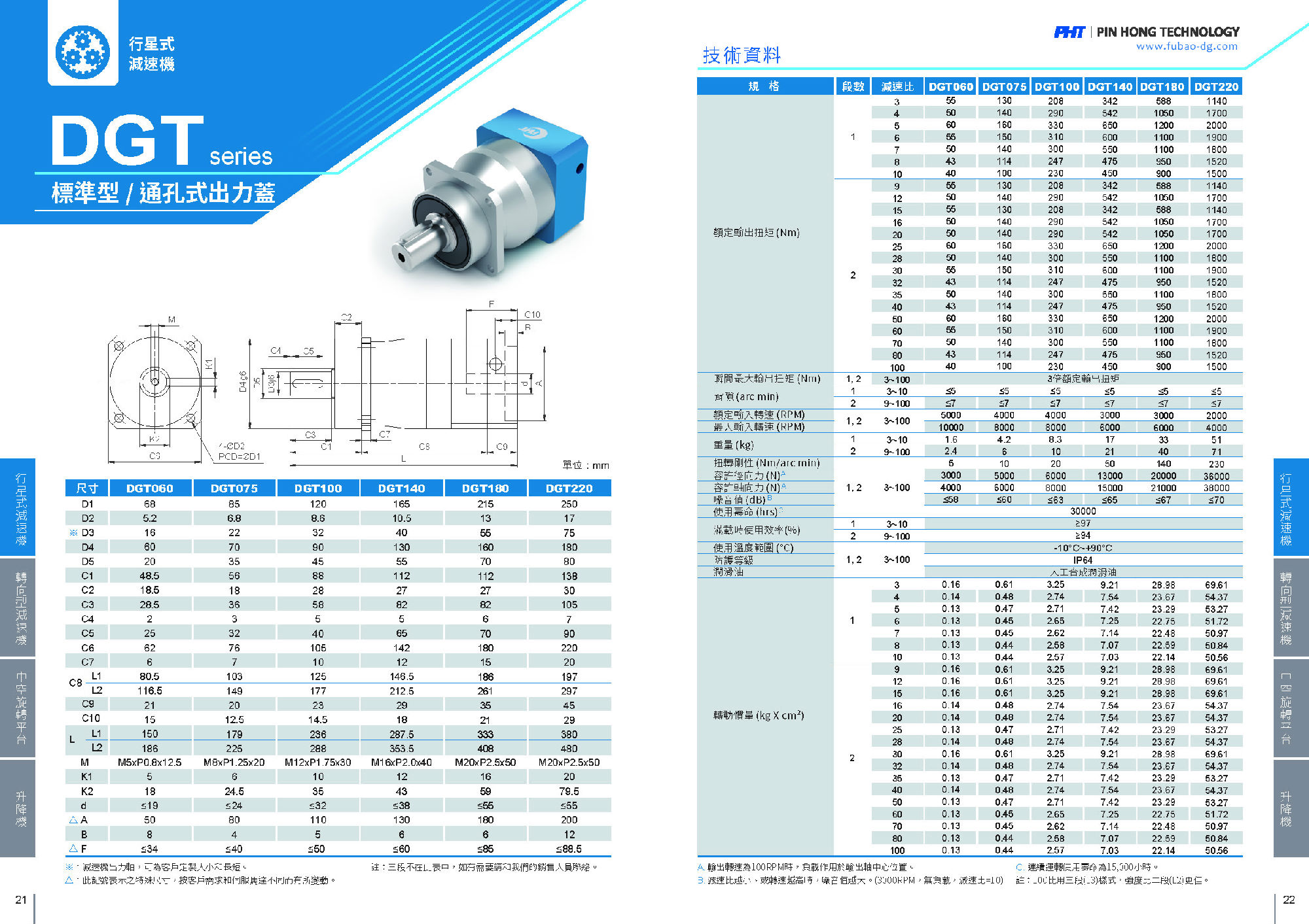 DGT斜齒行星減速機是標準型高精度減速機。 適合精度定位之需求,齒輪采用合金鋼材,內部搭配圓錐滾子軸承,使之可承受更佳的負載,安裝孔位為通孔式。 品宏減速機的軸承是用NSK品牌的,齒輪經過碳化,故精度和剛性都比較優(yōu)越!減速機出力軸是可根據客戶的要求去定制大小和長短的。