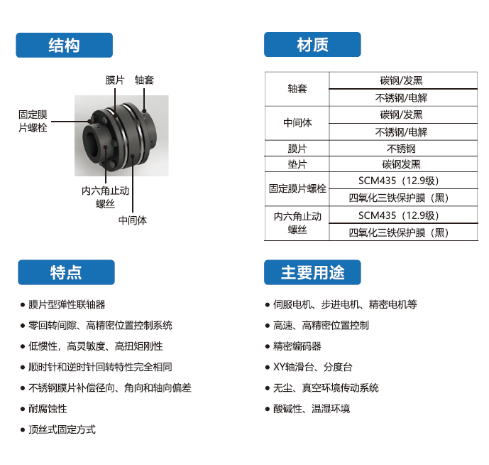 HSJP-G系列聯(lián)軸器采用碳鋼發(fā)黑,利用脹緊套聯(lián)接的膜片型彈性聯(lián)軸器,廣泛用于伺服電機(jī)、步進(jìn)電機(jī)、精密電機(jī)等。