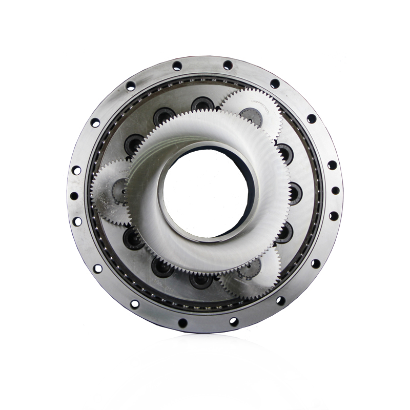 直齒輪與曲柄軸相連接,變?yōu)榈诙p速部的輸入。在曲柄軸的偏心部分,通過(guò)滾動(dòng)軸承安裝RV齒輪。另外,在外殼內(nèi)側(cè)僅比RV齒輪數(shù)多一個(gè)的針齒,以同等的齒距排列。
