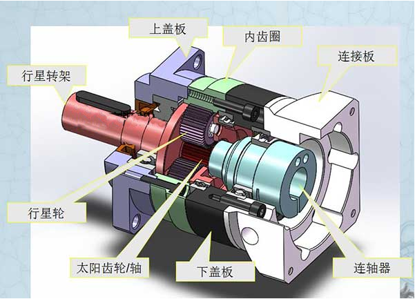 通過行星減速機內(nèi)部結(jié)構(gòu)圖紙,我們可以看出一臺行星減速機結(jié)構(gòu)包括:連接板、聯(lián)軸器、下蓋板、太陽齒輪、行星輪、內(nèi)齒圈、上蓋板、行星轉(zhuǎn)架。