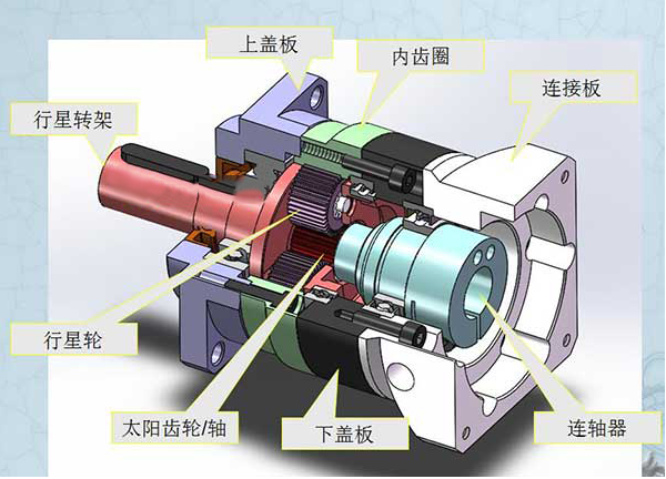 精密斜齒行星減速機的結構是十分緊湊的,從上圖中我們可以看出行星減速機的結構也是十分簡單的,主要包括:連接板、聯(lián)軸器、下蓋板、太陽齒輪、行星輪、內齒圈、上蓋板和行星轉架。