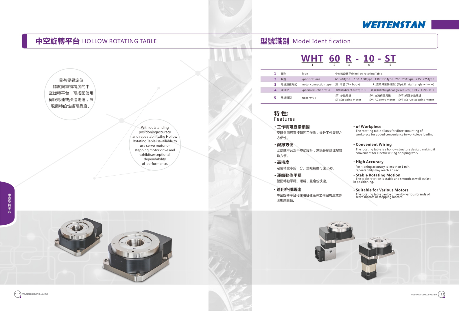 WHT系列中空旋轉(zhuǎn)平臺。 具有優(yōu)異定位精度與重復精度的中空旋轉(zhuǎn)平臺,可搭配使用伺服馬達或步進馬達,展現(xiàn)獨特的性能可靠度。 工作物可直接鎖固。旋轉(zhuǎn)盤面可直接鎖固工作物,提升工件裝載之方便性。 配線方便。此旋轉(zhuǎn)平臺為中空式設(shè)計,無論是配線或配管均方便。 高精度。定位精度小于1分。重復精度可達±5秒。 運轉(zhuǎn)動作平穩(wěn)。盤面轉(zhuǎn)動平穩(wěn),順暢,且定位快速。 適用各種馬達。中空旋轉(zhuǎn)平臺可采用各種廠牌之伺服馬達或步進馬達驅(qū)動。
